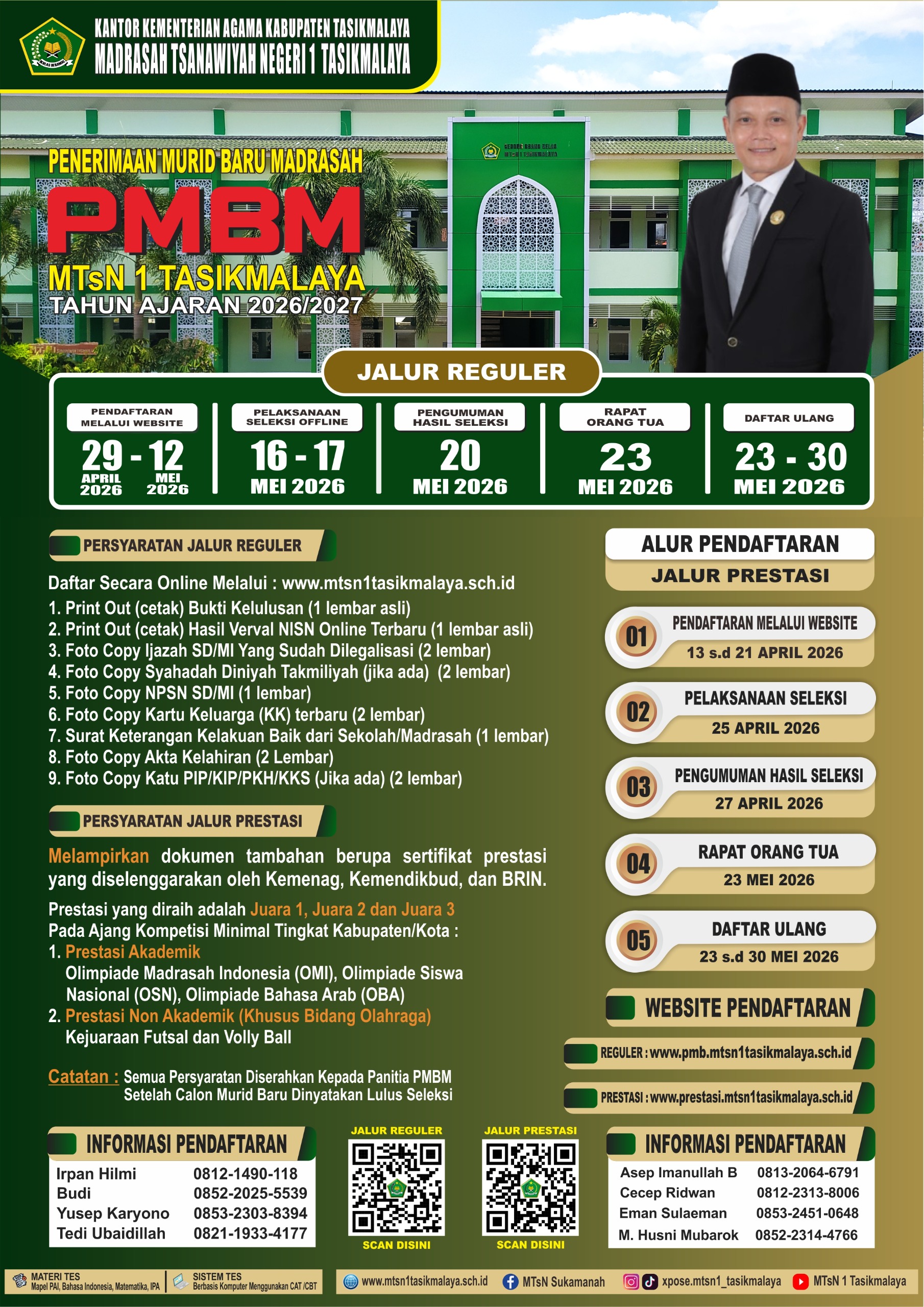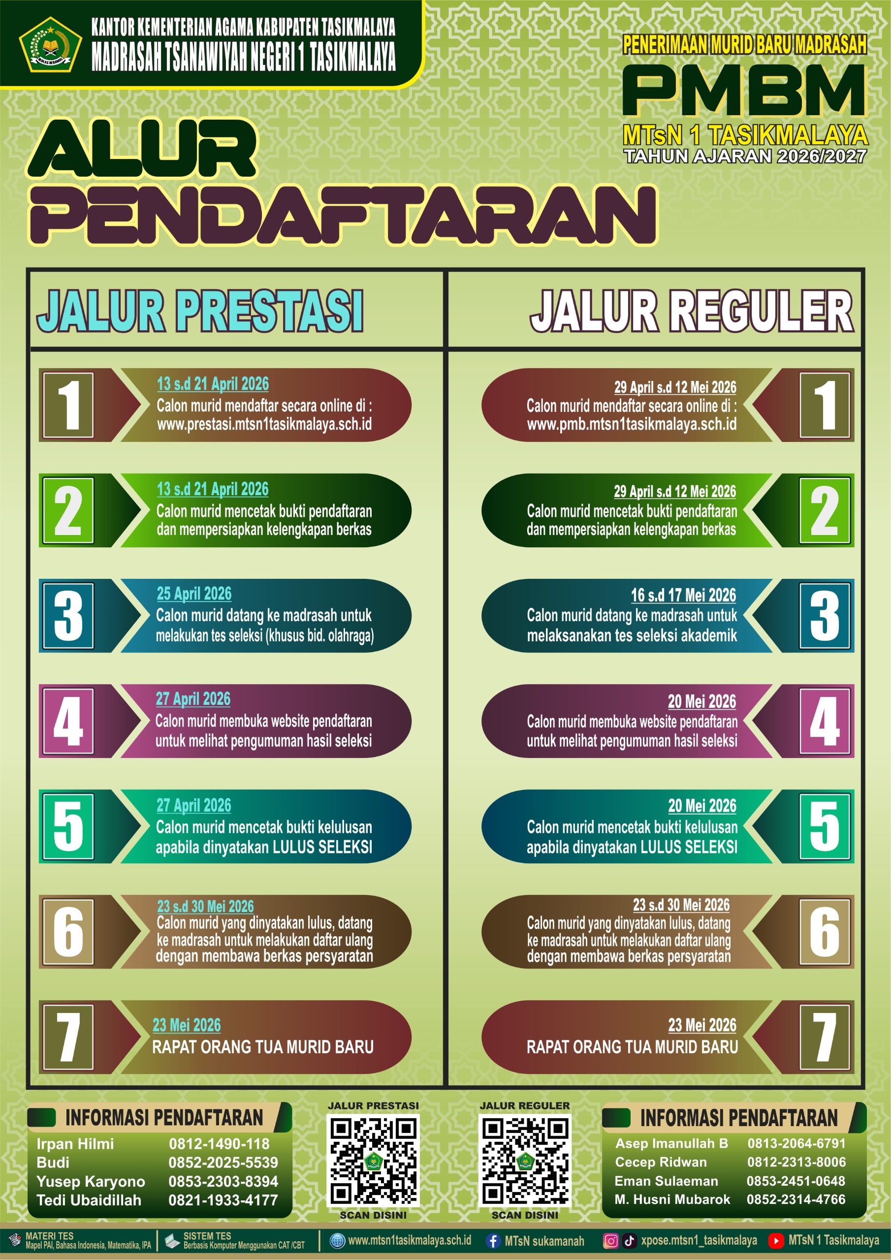 MTs Negeri 1 Tasikmalaya menyediakan PMB jalur Prestasi secara online diharapkan proses PMB dapat berjalan cepat dan bisa dilakukan dimanapun dan kapanpun selama sesi PMB dibuka. Proses pendaftaran calon siswa baru tidak menggunakan formulir konvensional hanya dengan mengakses website PMB Online MTs Negeri 1 Tasikmalaya. Jalur khusus yang dimaksud yaitu dari prestasi siswa yang ditunjukkan dengan adanya sertifikat, bukan dari nilai dan ranking Raport.